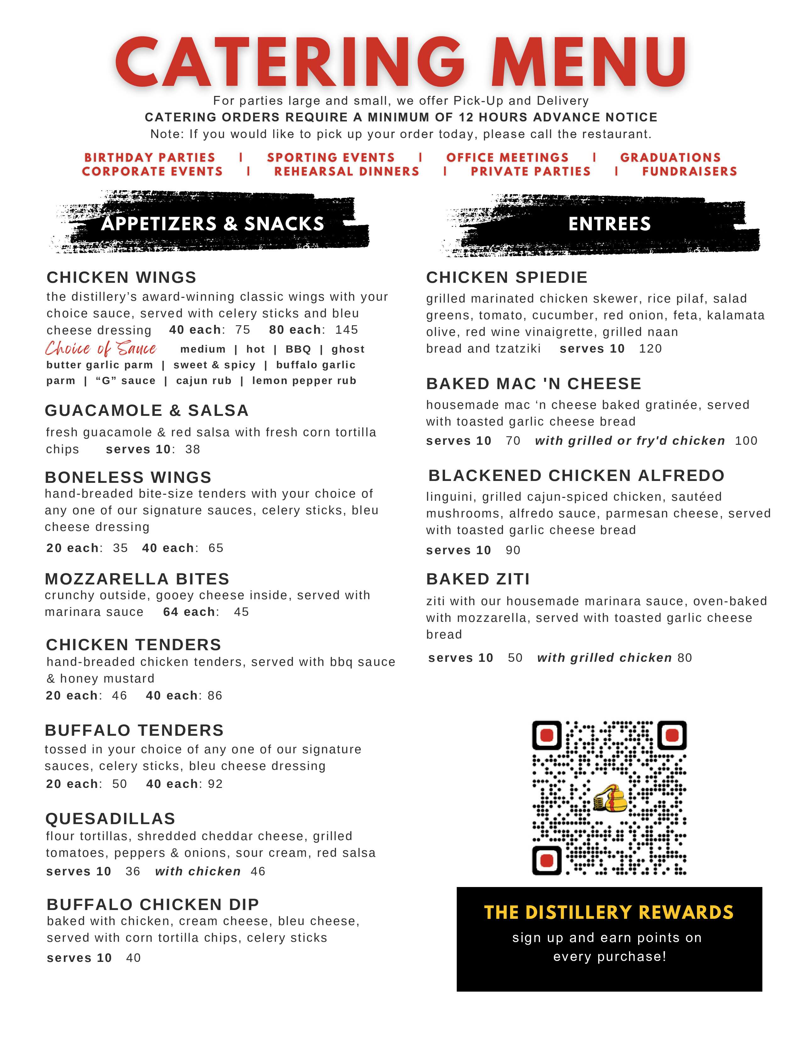 Whatever the size, whatever the occasion, The Distillery is ready for your next big or small catering event. Be it a corporate event, reunion, rehearsal dinner, fantasy football draft, birthday party, anniversary or FUNdraiser— you name it, we have all the bases covered. Choose from our distinctive catering menu or contact us to customize a party menu that fits your taste and budget! Our mission is to make your party a success!