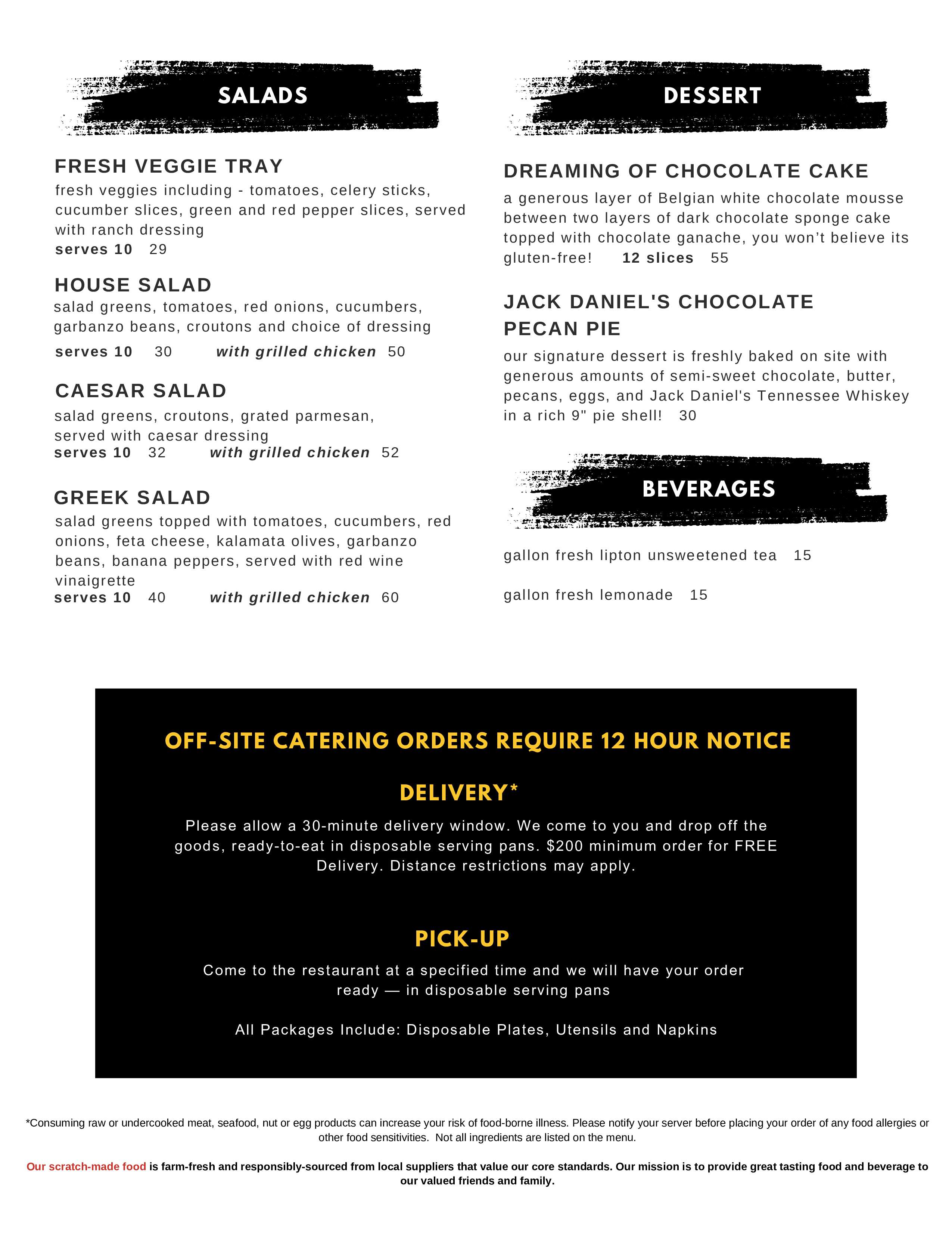 Please allow a 30-minute delivery window for Catering Orders. We come to you and drop off the goods, ready-to-eat in disposable serving pans. All Packages Include: Disposable Plates, Utensils and Napkins.